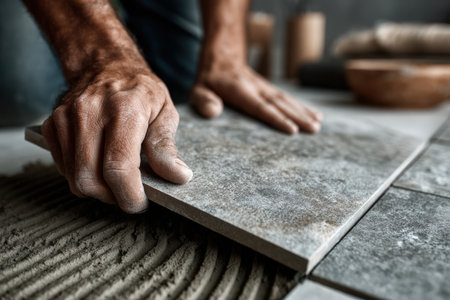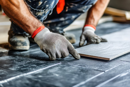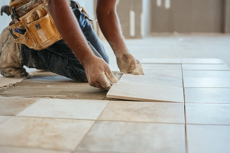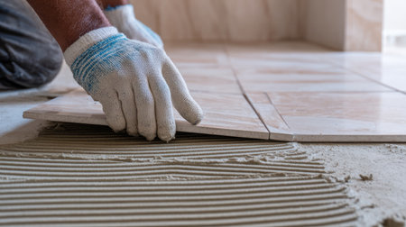 A dedicated craftsman expertly installs tile flooring during a renovation project. The image captures focused hands at work, showcasing skill and precision.
