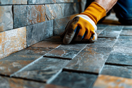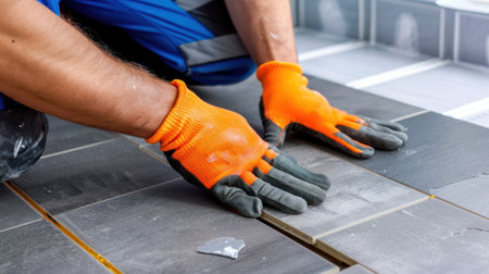 A professional worker focuses on the meticulous installation of gray tiles on a floor while wearing bright orange gloves for safety. The image captures the hands-on work involved in home renovation.