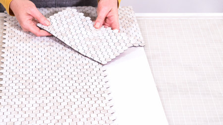 In the process of mounting peel and stick mosaic tiles onto a foam board, perfect for enhancing a food photography studios aesthetic.