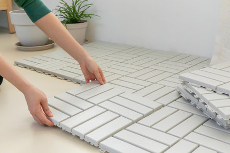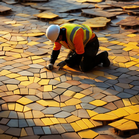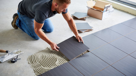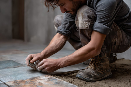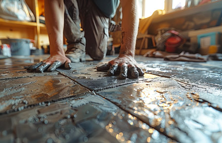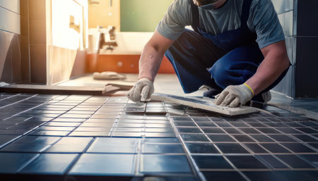 worker carefully laying new tiles, highlighting the precision and attention to detail in the tiling process.Generative AI