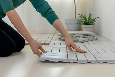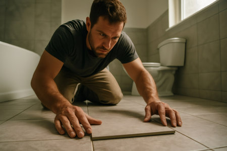 Tiler skillfully placing ceramic tiles on a bathroom floor, transforming the space during essential renovation work for home improvement