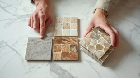 This image features hands selecting different stone tiles displayed on a marble surface, showcasing diverse textures and colors ideal for home renovation and design projects.