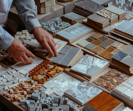 In a bright workshop, a worker carefully arranges various tiles on a display board to create an attractive presentation for potential customers.