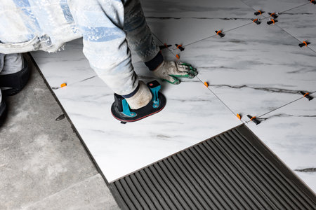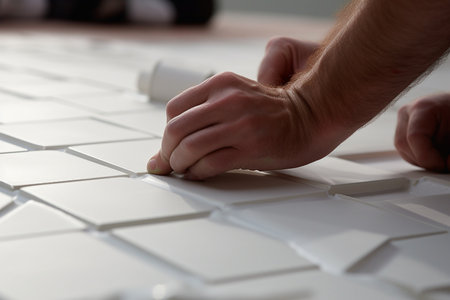 Close-Up of Skilled Worker Placing Ceramic Tiles on Floor with Focused Hands and Fine Details in Construction and Renovation Project