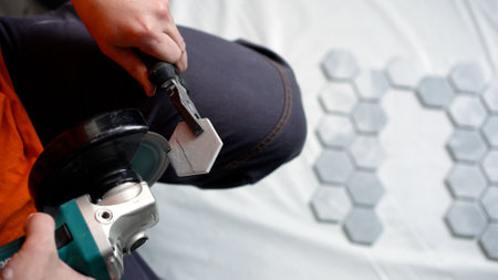 Construction worker smoothing edges of hexagonal tiles using an angle grinder, preparing for precise installation