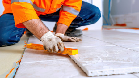A construction worker wearing orange safety gear diligently lays floor tiles while measuring for accuracy. The focus is on precise installation for a renovation project.