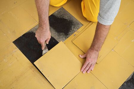 Worker laying ceramic tile flooring on a building site. Construction concept.