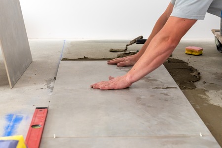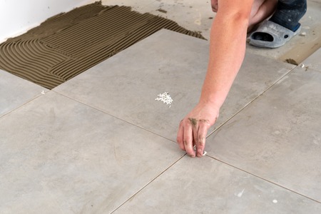 Tiler placing porcelain tile in position over adhesive. Floor tile installation