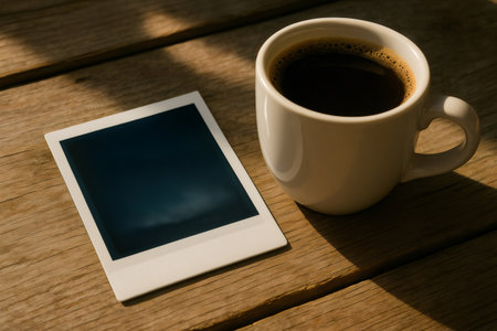 Relaxing morning with a cup of coffee and an old instant photo on a wooden table, enjoying the sunlight