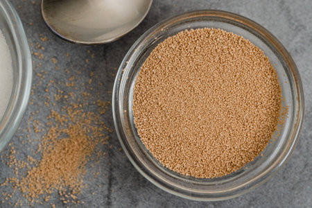 A close-up macro view reveals the granular texture of dry yeast with a wavy surface.