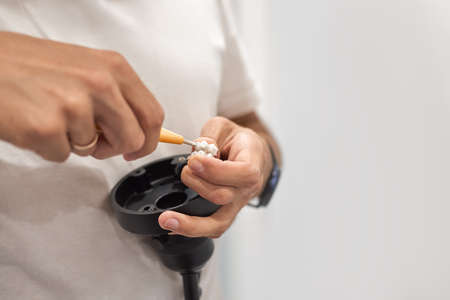 Hands of the master in gloves hold wire cutters and wire closeup on black background. Electronics Repair Idea