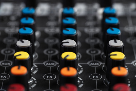 Detail of potentiometers and controls of a multichannel audio mixer used to manage a concert
