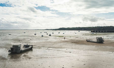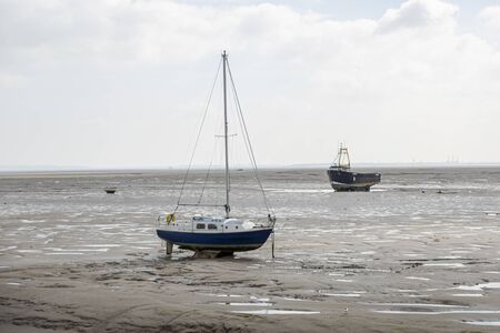 Fisherman boats stuck on the beach in low tide period in Leigh-on-Sea, UK.
