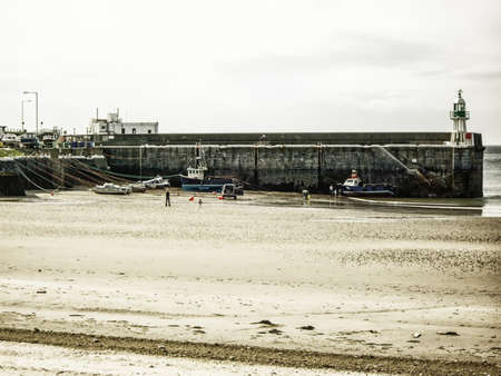 Boats on the sand at low tide in the harbour of New Quay, Wales (Ceredigion)