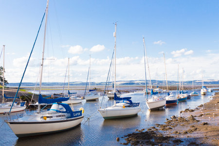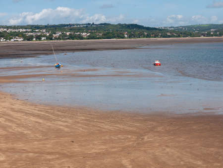 Red Wharf Bay, Anglesey, Wales. Pleasure boats at low tide on the sand flats of this beautiful destination. Landscape aspect shot with copy space.
