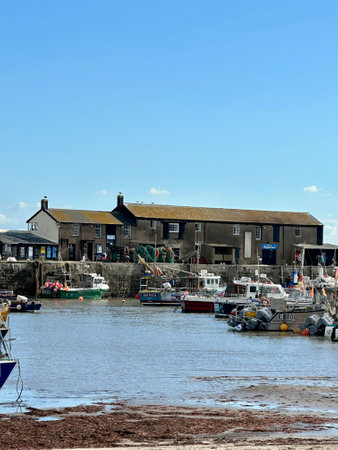 WEST BAY, UK - OCTOBER 10, 2022 - Elevated view of traditional fishing boats moored in the harbour at low tide with the town and countryside to the rear, West Bay, Dorset, UK, Europe, October, 2022.