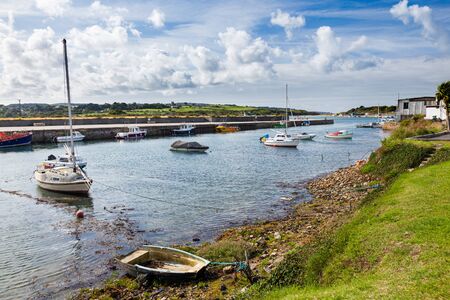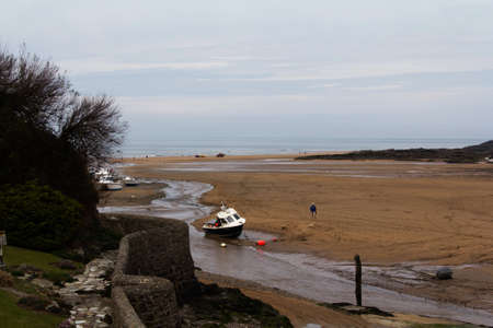 Clonakilty Bay at low tide on a cloudy day. A small blue fishing boat is anchored. Open seabed, silt and algae. picturesque seaside landscape.