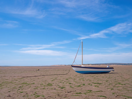 Small sailing boat, yacht on deserted beach.Escape, holiday, vacation. Getting away from it all concept. UK, European beach.