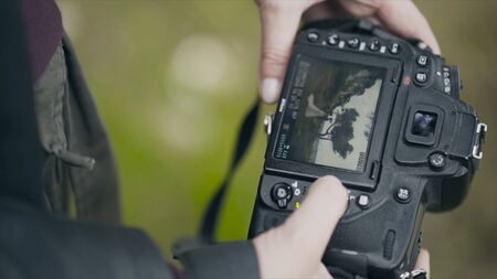 Close-up of camera screen with wedding photos. Action. Professional camera in hands of photographer looking at resulting wedding photos.
