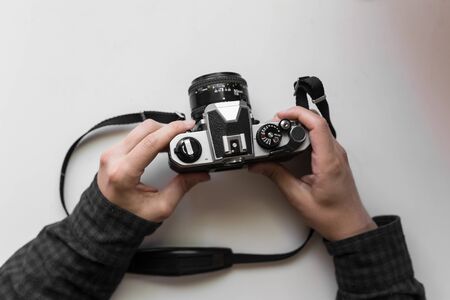 Vintage Pentax film camera in the hands of a man on a white background. Horizontal. top view