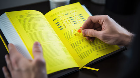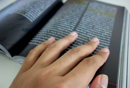 man is reading a book, male hands are holding a book, side view close-up, selective soft focus.