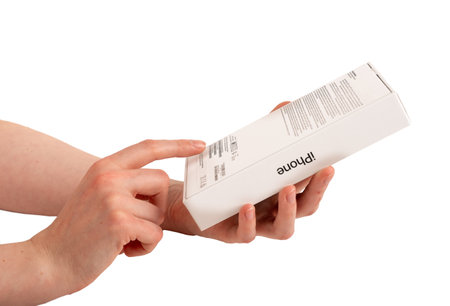 Lodz, Poland May 14 2023 Hands and iphone 14 pro max in box, checking, reading information on package, imei and serial number.