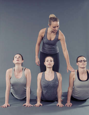 A young caucasian woman is teaching yoga stretching pose to her friend at home.