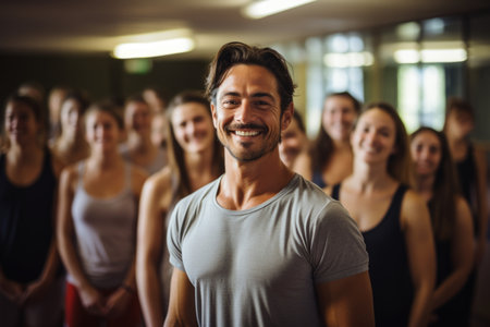 A confident male fitness instructor stands in front of his workout class, showcasing enthusiasm and energy. Participants engage in strength training, emphasizing community and motivation.