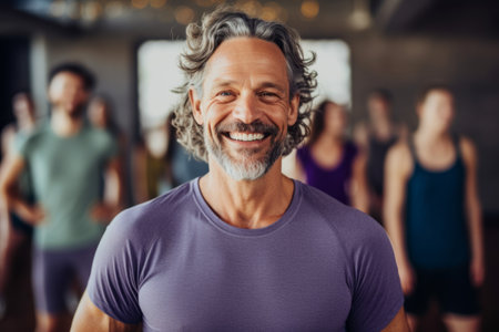 A gym instructor leading a group of seniors in a relaxing yoga class, promoting fitness and well-being in a bright, serene studio setting.