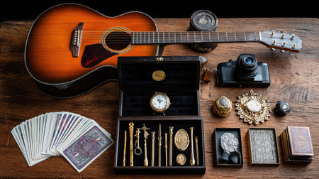A beautifully arranged still life showcasing a vintage guitar alongside various collectibles, including playing cards, a pocket watch, and a camera, reflecting elegance and nostalgia.