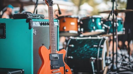 Vibrant close-up of guitars, amps, and drums set up on an outdoor festival stage before the concert