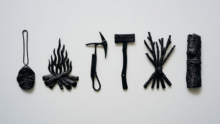 Black Solid Fire Starting Essentials Silhouettes Set of Six isolated on plain white background.