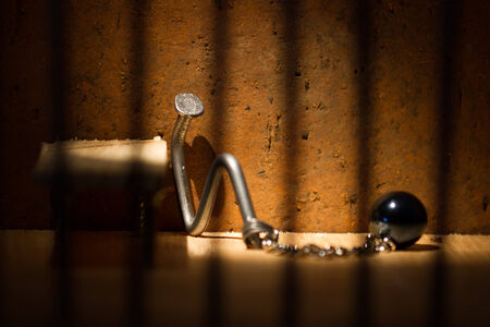 Conceptual jail photo with iron nail ball and chain behind out of focus bars