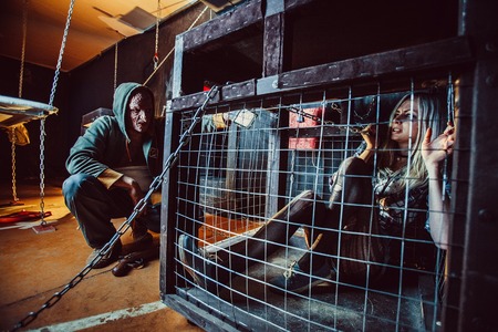 Bloody maniac and his female victim in the cage.