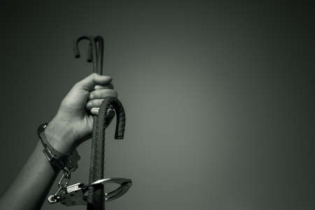 Chained human hands sticking out in a prison.Gray wall.Selective focus.