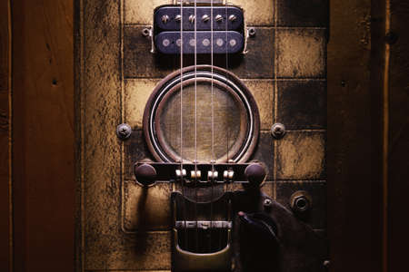 Details of a handmade cigar box guitar.