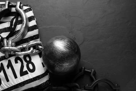 Prisoner ball with chain and jail clothes on black table, flat lay. Space for text
