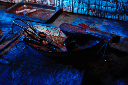 A creepy room with bloodstained walls and medical instruments.