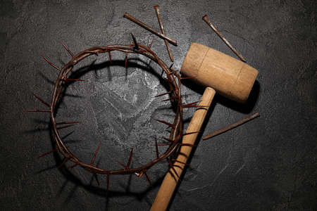 Crown of thorns with mallet and nails on dark background