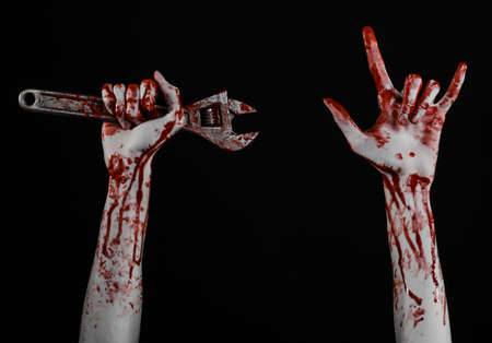 Halloween theme: bloody hand holding a big wrench on a black background studio