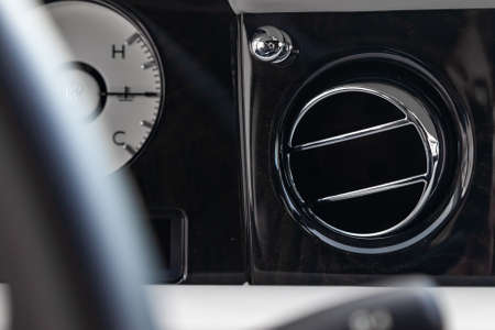 A close-up view of a part of the interior of a modern luxury car with a view of the ventilation deflector of the stove for heating and cooling the passenger compartment with black trim elements