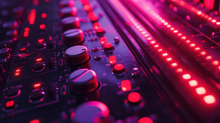 Sound board with vivid lights in the background, ideal for music events and designs with a concert theme.