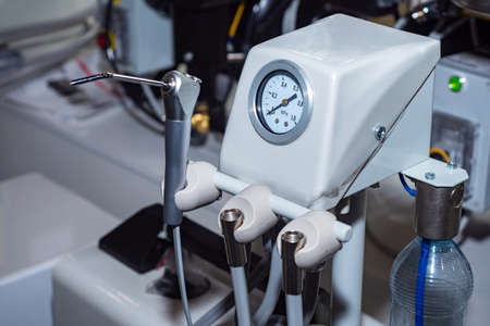 Fragment of a dental unit. Saliva ejector at the dental unit. Pressure sensor next to saliva ejector. Concept - sale of dental equipment. Dentist equipment sales. Stomatological pistol.