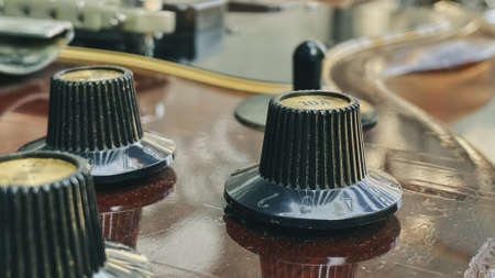 Close-up view of the knobs of an amplifier for adjusting the sound of stringed musical instruments. Concert and live performance. Music and entertainment
