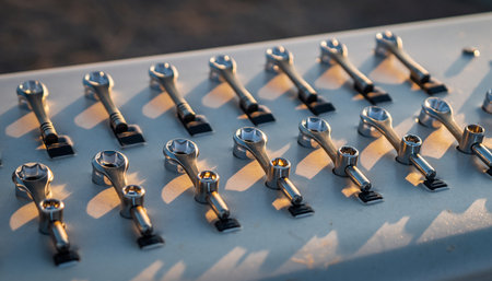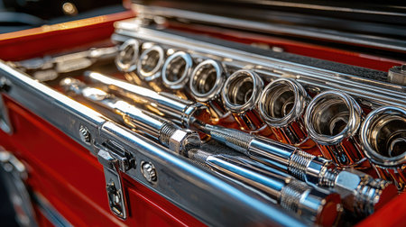 A close-up view showcasing polished chrome tools inside a vibrant red toolbox illuminated by sunlight, highlighting the craftsmanship and detail of each tool. Perfect for themes of mechanics and repair.