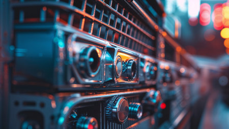 Chrome details of a classic car radio shine, highlighting the tuning knob and buttons. Ai generated image