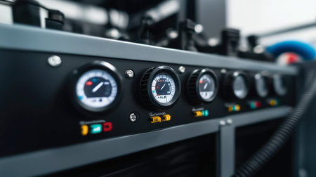 Close-up view of an industrial control panel featuring pressure gauges and various switches, highlighting precision measurement and equipment functionality.