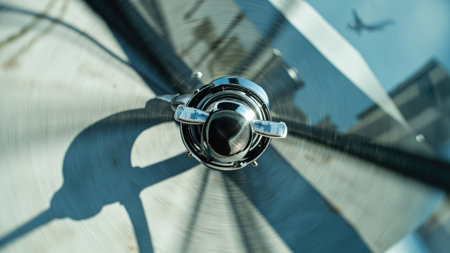 Close-up of a shiny silver metal object with a central knob and wing-like elements with a blurred plane in the background.