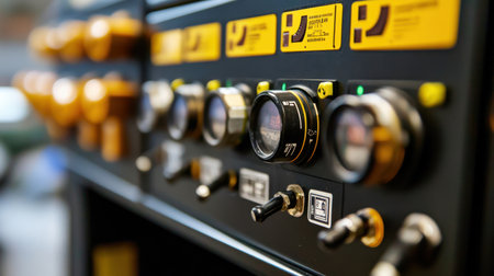 This image captures a close-up of an industrial control panel filled with various dials and switches, showcasing essential equipment for efficient machine operation in a factory.