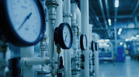 A striking industrial scene featuring a detailed view of pipes with pressure gauges within a modern factory environment, showcasing efficiency and advanced technology.